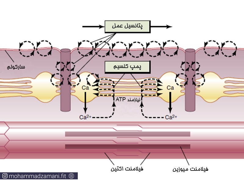 8. پس از کسری از ثانیه، یون های کلسیم، توسط پمپ کلسیم، مجدداً به درون شبکه سارکوپلاسمی پمپ شده و در همانجا ذخیره می شود تا پتانسیل عمل دیگری از راه برسد. بازجذب کلسیم به درون شبکه سارکوپلاسمی، باعث توقف فرایند انقباض می شود.